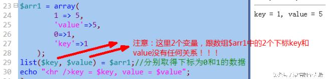 //$key 和 $value 就是该遍历语句一次次取得的数组的每一个单元(项)的下标和对应值。