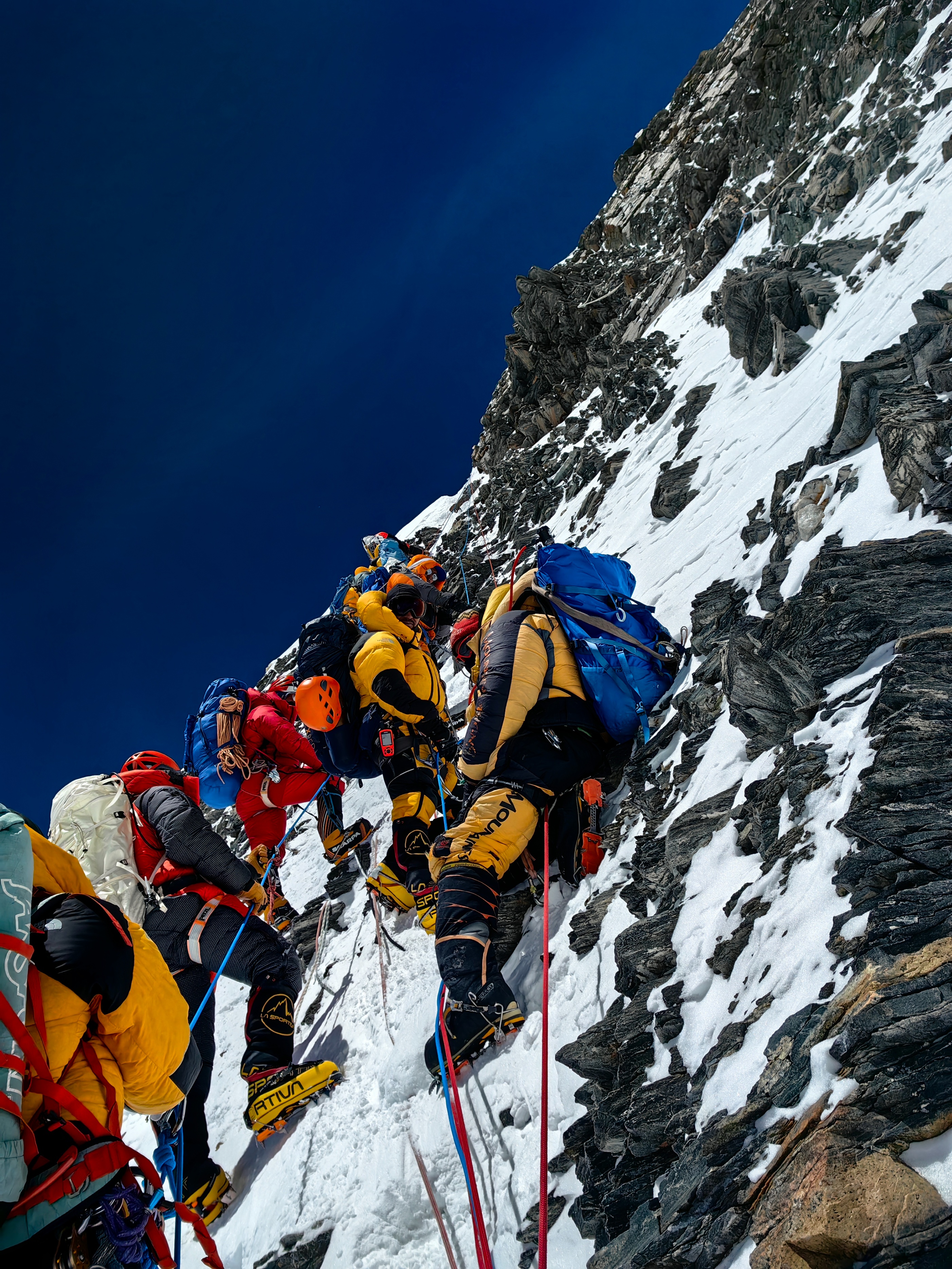 5月17日早晨,当登顶成功后,顾旭明从山顶回头看希拉里台阶,发现“密密麻麻的都是人”,希拉里台阶“堵车了”!