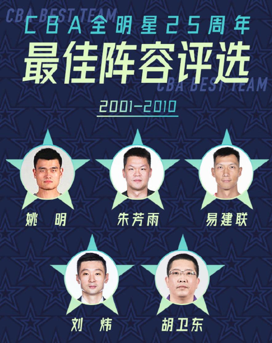从2001年到2010年,最佳阵容乃是姚明和阿联引领,同时有刘炜,胡卫东和朱芳雨,这个时代的最佳阵容承上启下,既有元年时的老人,也有新千年的青年才俊,朱芳雨和阿联。