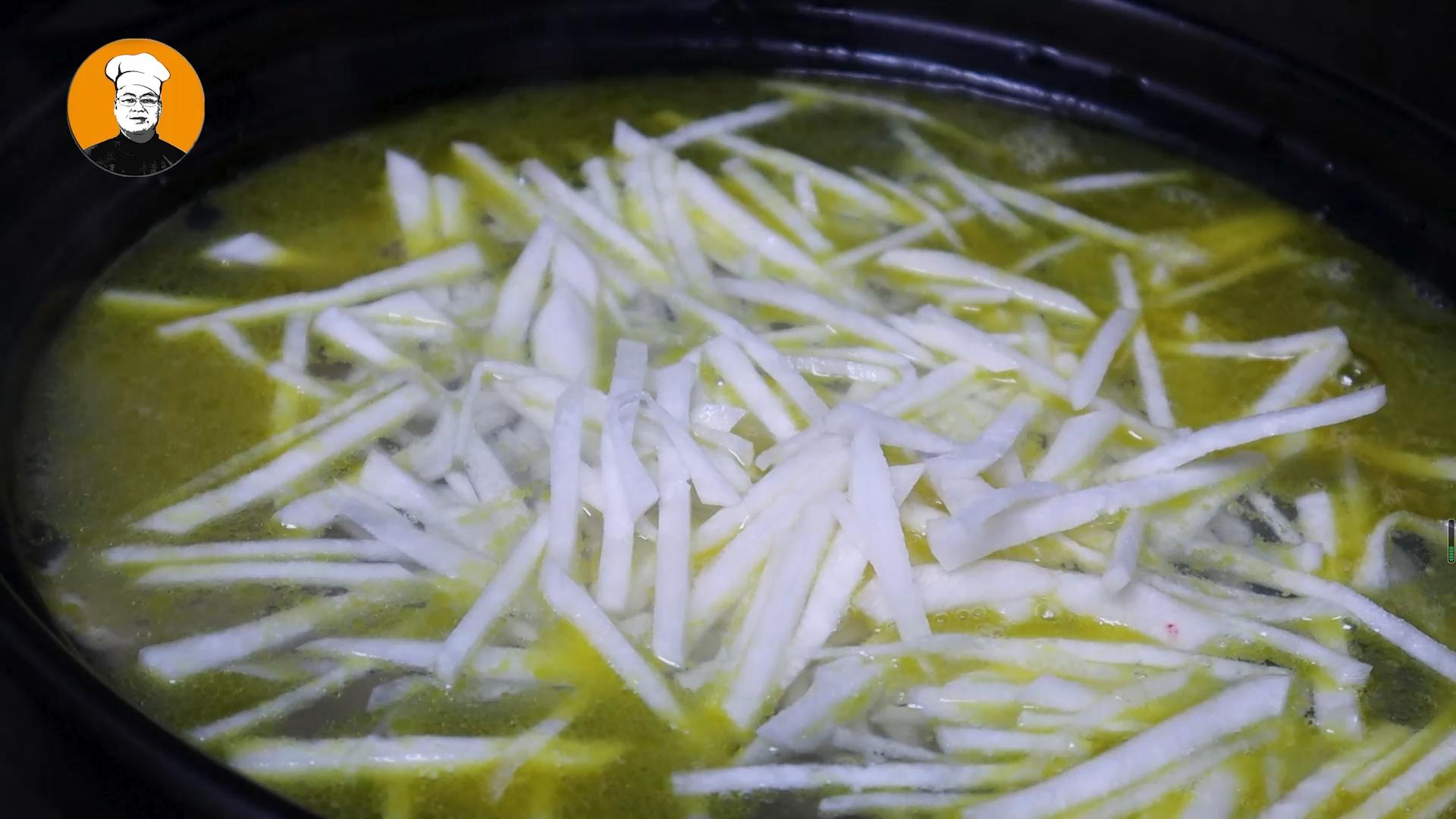 8、爆香以后放入鱼骨一起翻炒,翻炒去腥以后再放入开水,开水和菜籽油烧出来的鱼汤汤更白,再放入切好的萝卜丝,盖上锅盖,大火烧开,中小火慢炖20分钟。时间到时,放入两勺食盐,白胡椒粉去腥,撒上葱花点缀,鲫鱼汤就做好了