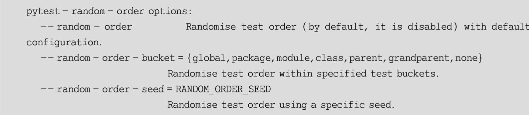 该插件允许用户控制他们想要引入的随机性级别,并禁止对测试子集进行重新排序。通过传递先前测试运行中报告的种子值,可以按特定顺序重新运行测试,如图5-15所示。