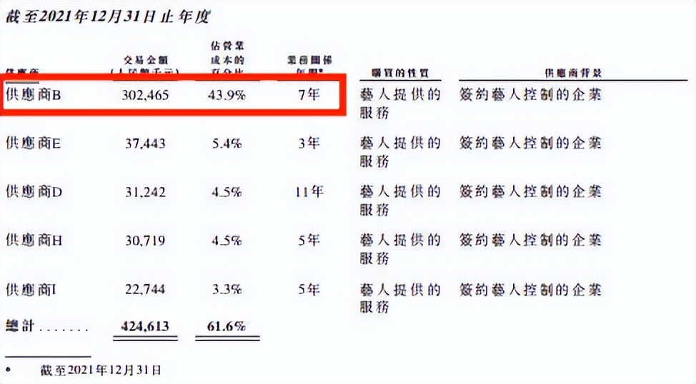 为了保护艺人的隐私,公司用供应商来表示旗下艺人。2019年到2021年,乐华分别向供应商B支付了3227万元、1.33亿元、3.02亿元。三年累计4.667亿。
