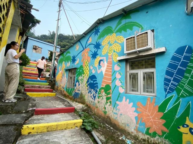 在南丰纱厂打卡叹完美食后,可以到有「港版彩虹眷村」之称的光板田村逛逛。墙壁画上颜色团子,画风可爱,原来是出自一班小朋友义工和村民的画工。最受欢迎的打卡位置就是缤纷的彩虹楼梯和可爱的彩色小屋。