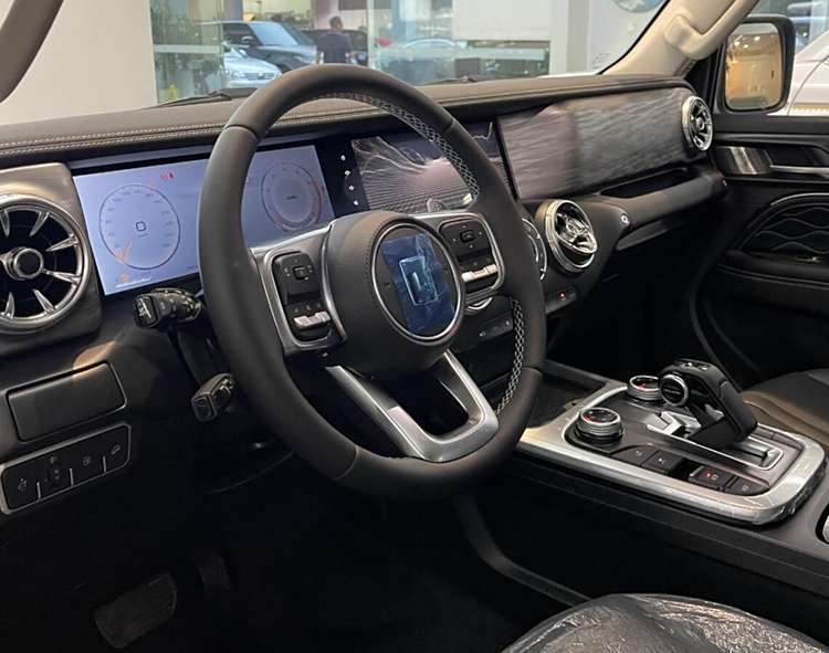 坦克300 Hi4-T的内饰设计的沉稳高级,T型的中控台布局合理,采用的是对称式的布局,部分区域采用的是皮质以及软质材料包裹,细节处还装饰了木纹材质的饰板来提升档次感,全液晶仪表盘能够显示丰富的数据,数据的显示细腻。多功能方向盘造型扁平,采用的是皮质材料包裹,抓握感不错。中控屏内置的车机系统功能丰富,UI界面设计的较为精致。副仪表台区域的布局合理,电子换挡杆的造型厚实,周边配备了整齐的物理按键。