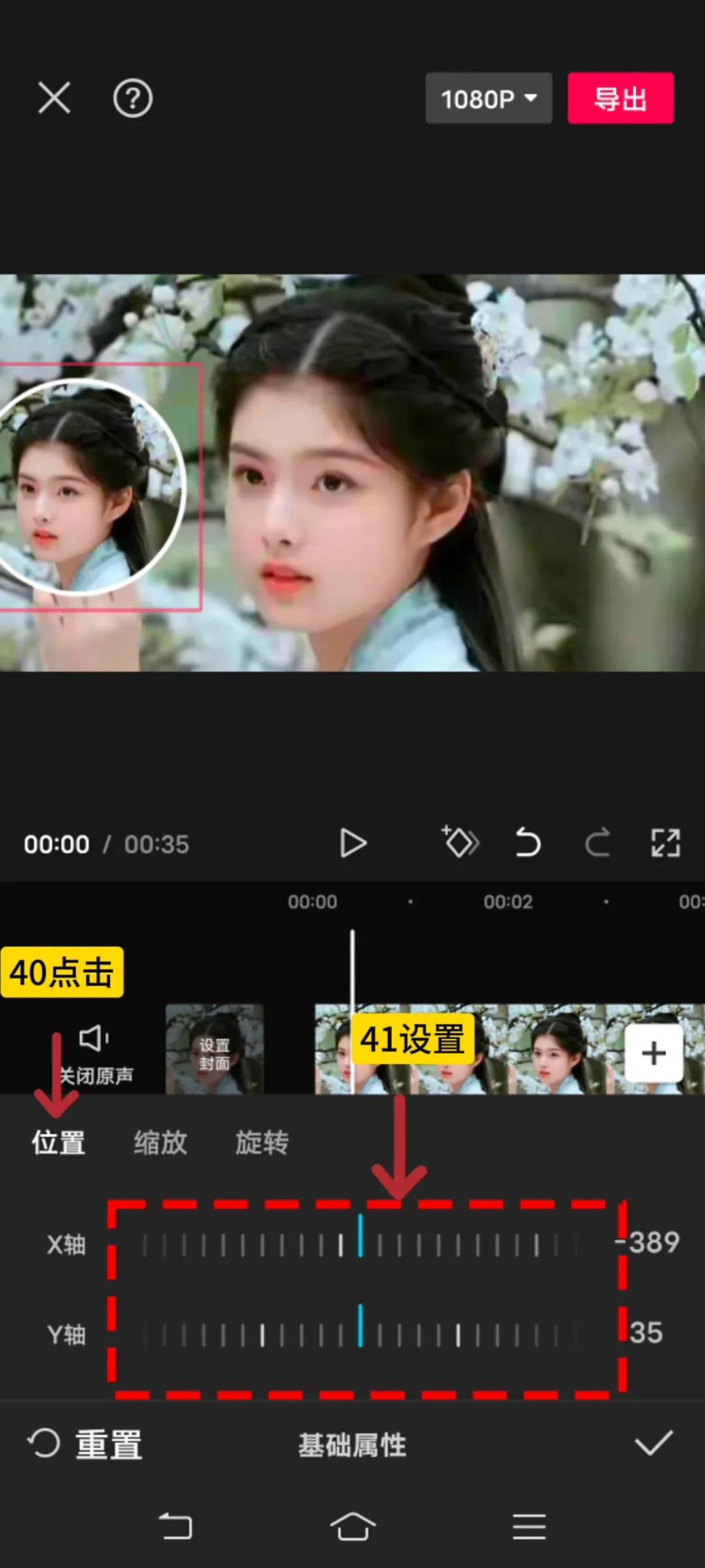 下面就可以在预览区域调整画中画大小,将其移动到靠左边,工具栏点击“基础属性”按钮,如图12-21所示。