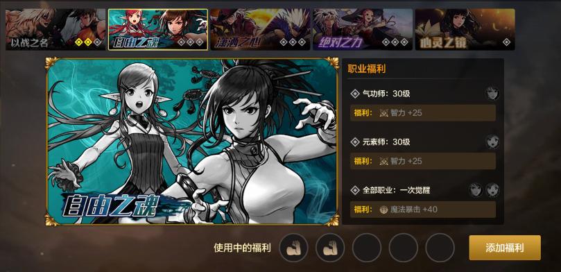 完成指定职业目标后,可以获得职业福利,可以理解为职业羁绊属性。该福利为冒险团共享,每个角色至多可选择5个福利进行添加。
