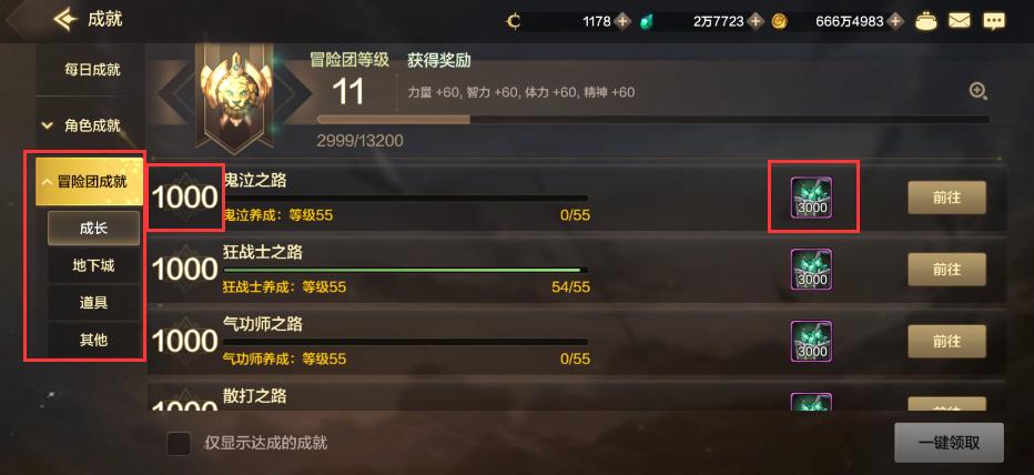 ●冒险团成就分类:按成就类型可以分为四类,分别是成长、地下城、道具、其他。