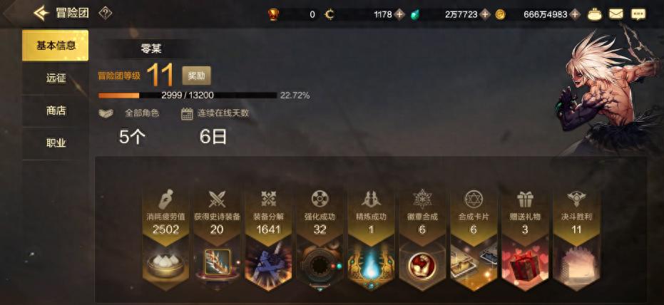 冒险团基本信息界面类端游设定,主页面显示冒险团团名,等级,在线情况等。主页面下方显示的则是最近完成的冒险团成就。