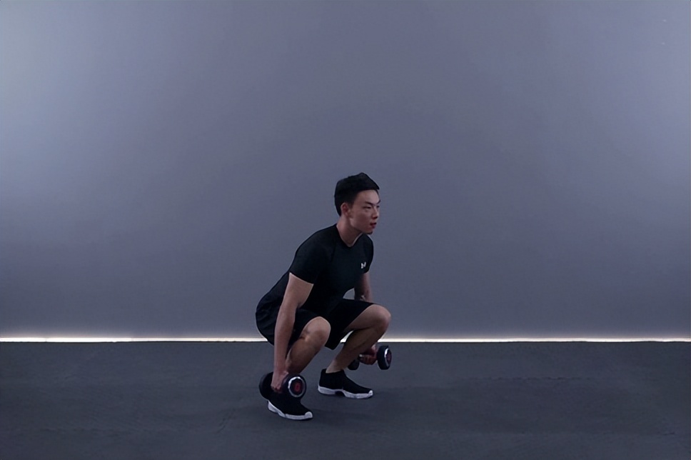 2.头向上抬,背部挺直,双手握紧。弯曲膝盖向后坐,直到大腿和地面平行为上。