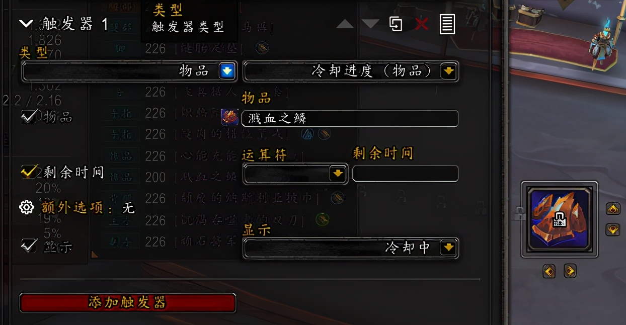 随后输入物品ID,例如饰品“溅血之鳞”的ID“179331”,随后WA界面中就能出现改饰品的图标了。监控饰品的图标与技能相同,可在“图示”一栏中更改图标大小或增加显示冷却等功能。