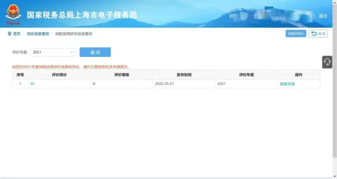 选择评价年度,输入查询年份,点击“查询”,即可看到本年度评价等级。