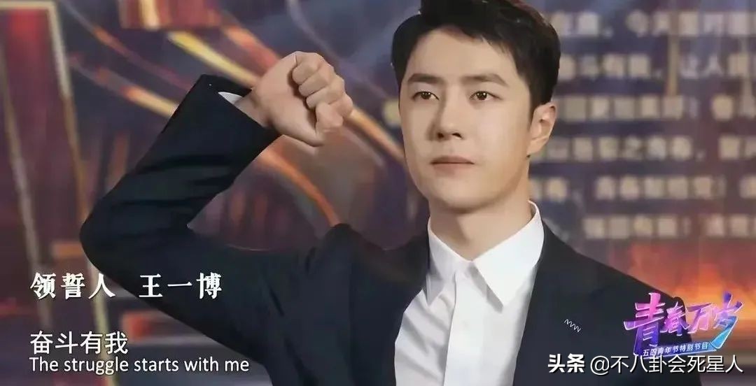 同样出席了五四晚会的,还有当红小生王一博,视频中王一博宣誓慷慨激昂,眼神坚定,只是脸上有些浮肿。