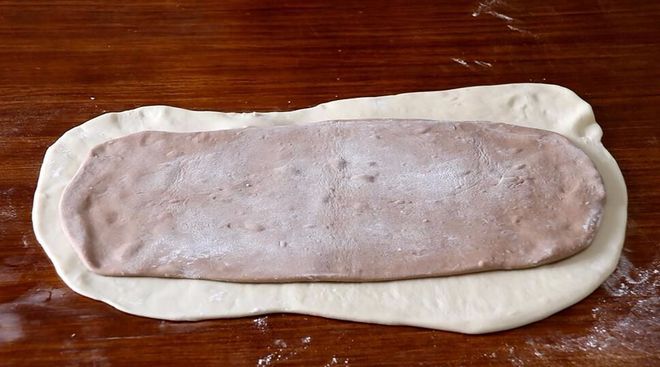 6、 同样将咖啡色的面团也擀成面片,在白色的上面刷一层水,将咖啡色叠在上面;