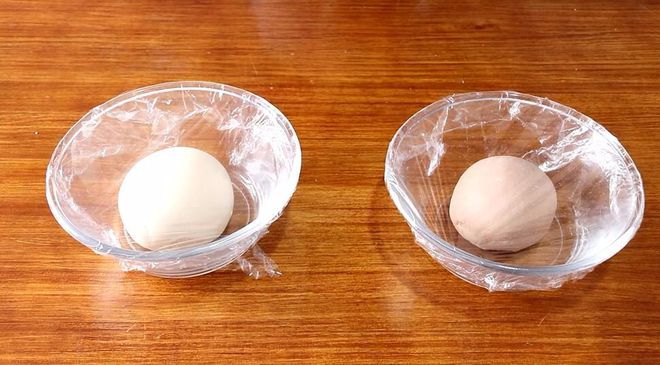①第一次醒发,揉好面团之后,盖上保鲜膜放一边比较暖和的地方醒发两倍大,这是首次醒发,发酵至体积变大,手指戳一下不反弹,很松软即可;
