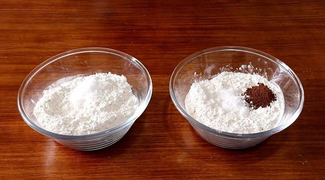 1、 准备两个碗,里面分别装入面粉,一个碗白面粉多一点的装入适量的白糖,另一个碗面粉少一点的加入一些可可粉,搅拌均匀;