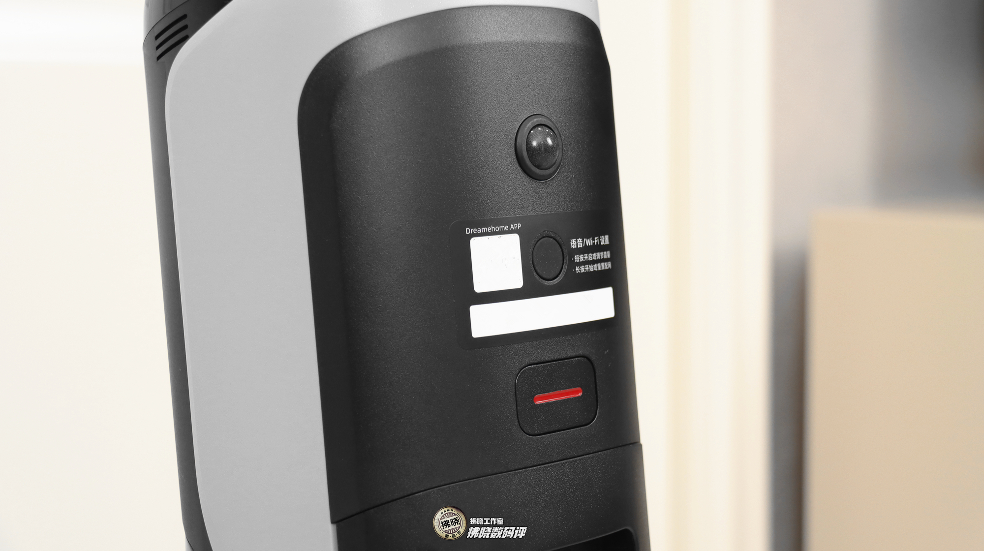 与机身正面相比,追觅H30 Ultra的机身背部则相对要简洁一些,我们可以看到顶端的Wi-Fi及语音设置按键,还能在旁边看到一个“小球”,这个“小球”可大有来头。由于追觅H30 Ultra支持180度平躺洗地,所以这个可以360度任意旋转“小球”的实际作用其实是“万向轮”,在机器处于平躺姿态时起到对主机的支撑作用。