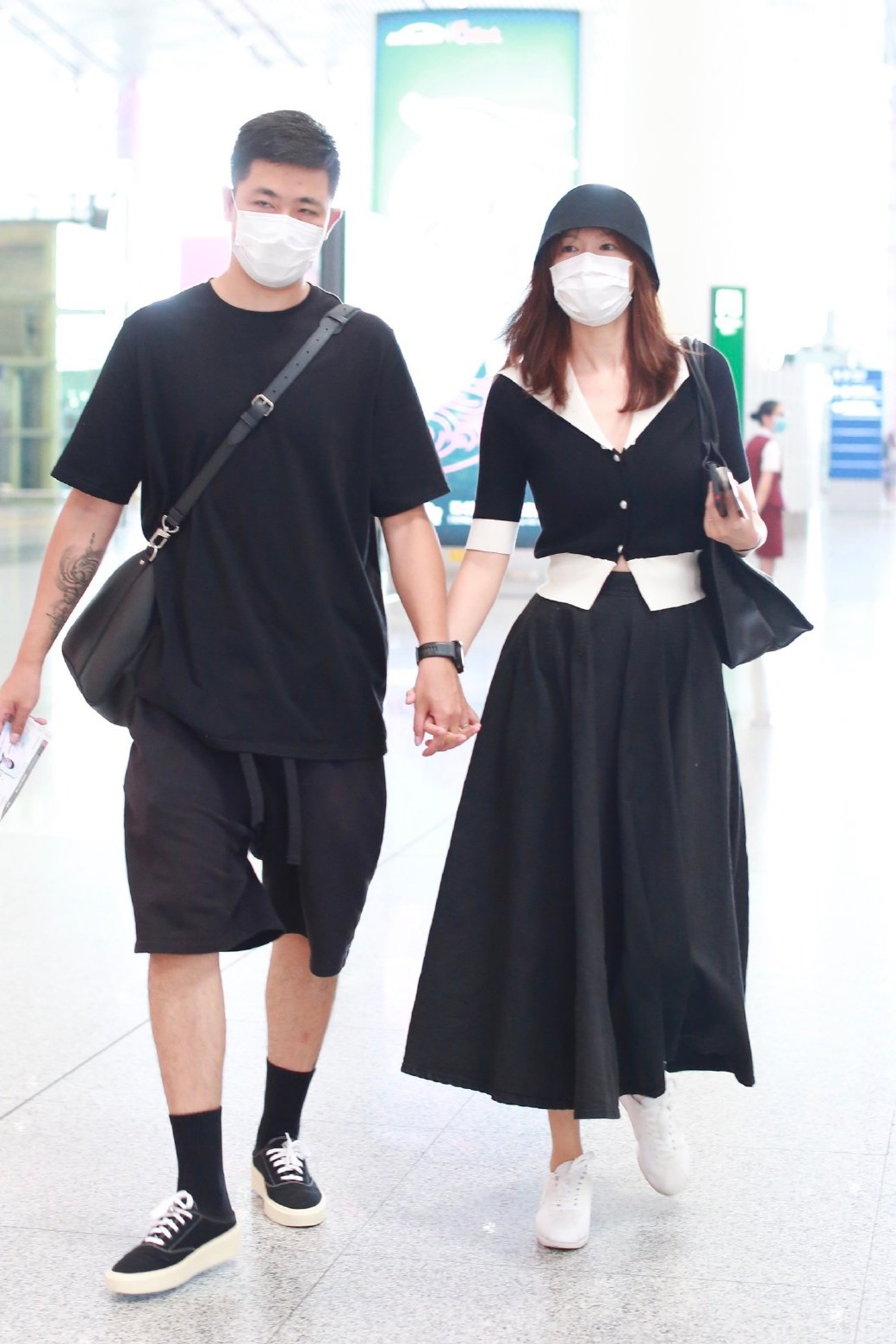 李艾经常会和自己的丈夫张徐宁一起走机场,这一次她换上了一条黑色的无袖连衣裙,连衣裙修身的设计清爽又别致,把李艾迷人的身材展现的淋漓尽致,不仅如此,她还具有着高挑的身形,身高优势大,穿上长裙也不压身高,运动风的look充满动感,怎么穿都很有朝气。胸前的印花图案童趣满满,打破单调和沉闷,让她越发的可爱了几分。张徐宁也是一身黑色造型,又帅又时尚。