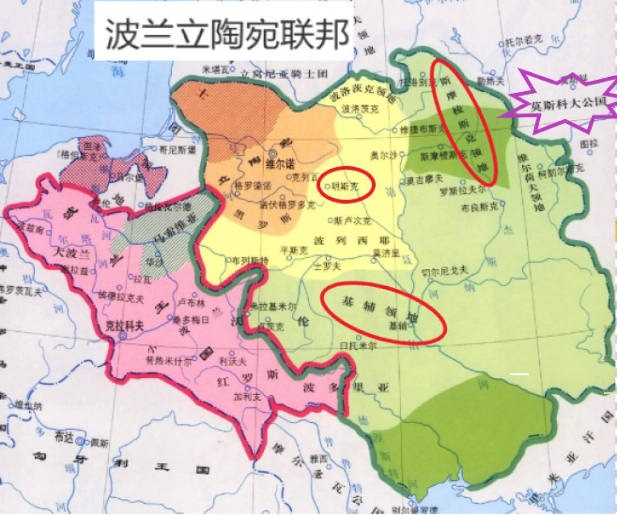 当时的波兰立陶宛联邦面积高达100万平方公里,包括现代白俄罗斯以及乌克兰大部分,甚至俄罗斯的斯摩棱斯克都在“大波兰”版图内,从下图可看出,波兰人主导的这个联邦已然扩张到当时莫斯科公国的眼皮下。