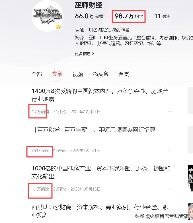 结合最近在头条推荐机制的观察来说,目前的头条推荐机制,有百度知道化的趋势。举个例子,前两年在B站火出圈的巫师财经,在头条也是有近百万粉的大V。我随手抽一下他的文章,阅读量普遍在1-10万级别。