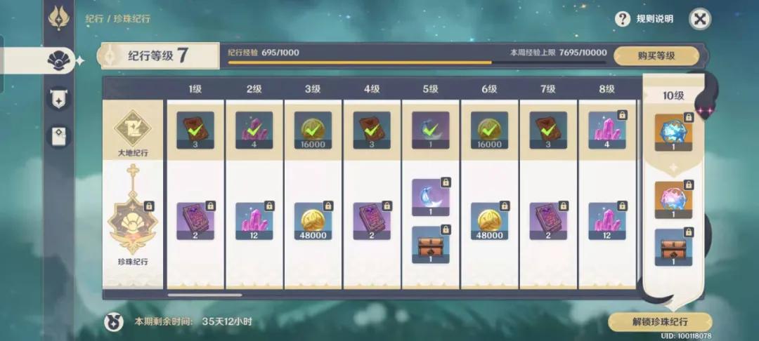 其实这个“纪行”的设定和其他游戏里面战令的设定差不多,通过完成每日任务,每周任务,以及当期任务增加纪行经验。从而拿到里面的各种奖励。这个纪行也有玩家称之为“大月卡”,如果充值68元可以获得更丰厚的奖励,也就是解锁珍珠纪行里面的相关奖励。