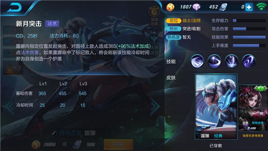 露娜向指定区域发起突击,对目标区域的敌人和沿途敌人造成中基础+96%法术加成的魔法伤害,如果单次突击中命中有被标记的敌人则移除本次技能的冷却并为自己创造一个护盾。