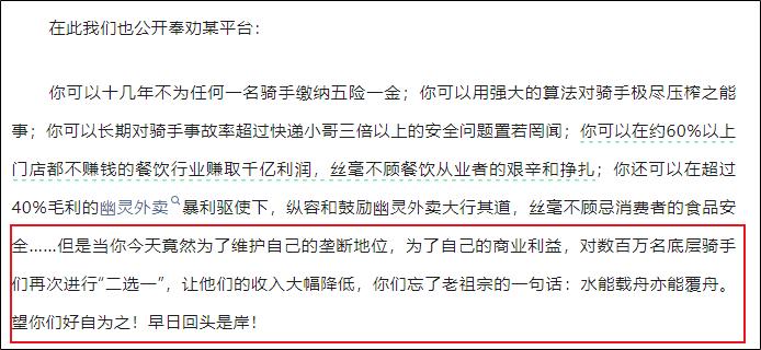 文内称,虽然用了“某平台”来指代,但是该说明正文中明确将21日早间京东官方发布的《致全体外卖骑手兄弟们的公开信》进行了逐字逐句批驳。