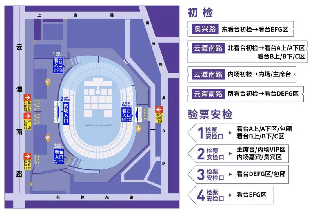● 前往看台A、B、C、D区域、包厢、主席台、内场区域的观众