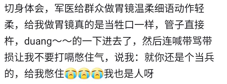 我当年本科就是在部队医院实习的,这题我知道哈哈哈,我们那附近就有部队,在外科轮转时有当兵的脚受伤,我的带教是个主治医生,直接缝,不上麻药,那个兵哥哥哎呦了一声,被主治老师说了一顿,这点苦也受不了!吓得兵哥哥根本不敢吱声。对待老百姓患者就很温柔...在心电图轮转时,经常遇到一队,几十个兵哥哥排队来做心电图,特别有纪律,整齐排队,提前解开衣服,挽好裤腿。