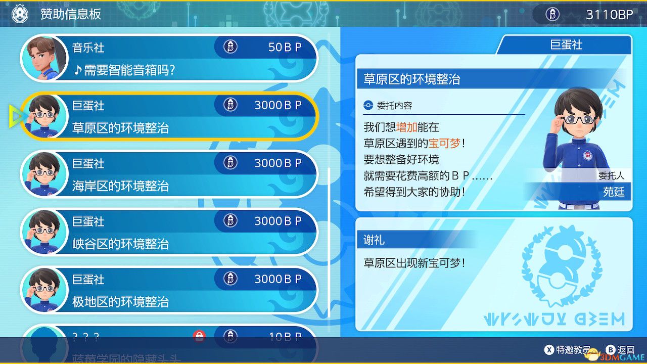 历代御三家需要赞助巨蛋社的4个区域环境整治后才会解锁。