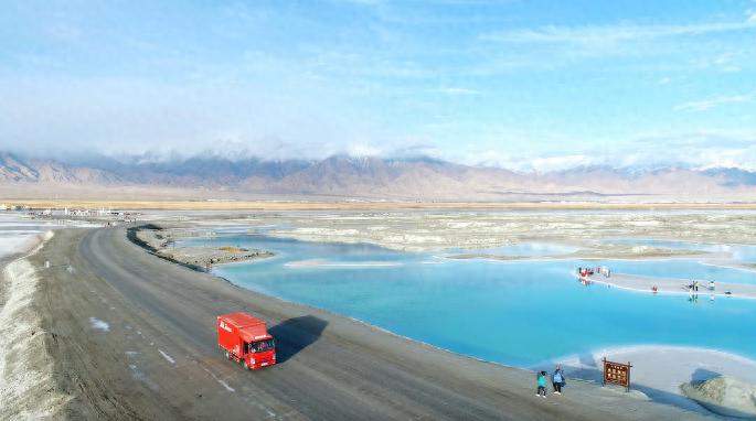 图说:10月31日,青海大柴旦翡翠湖,京东快递小哥送货中