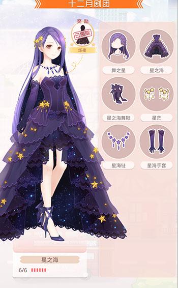 套装部件包含:发型(舞之星)、连衣裙(星之海)、鞋子(星之海舞鞋)、头饰(星茫)、颈饰(星海链)、手套(星海手套)、