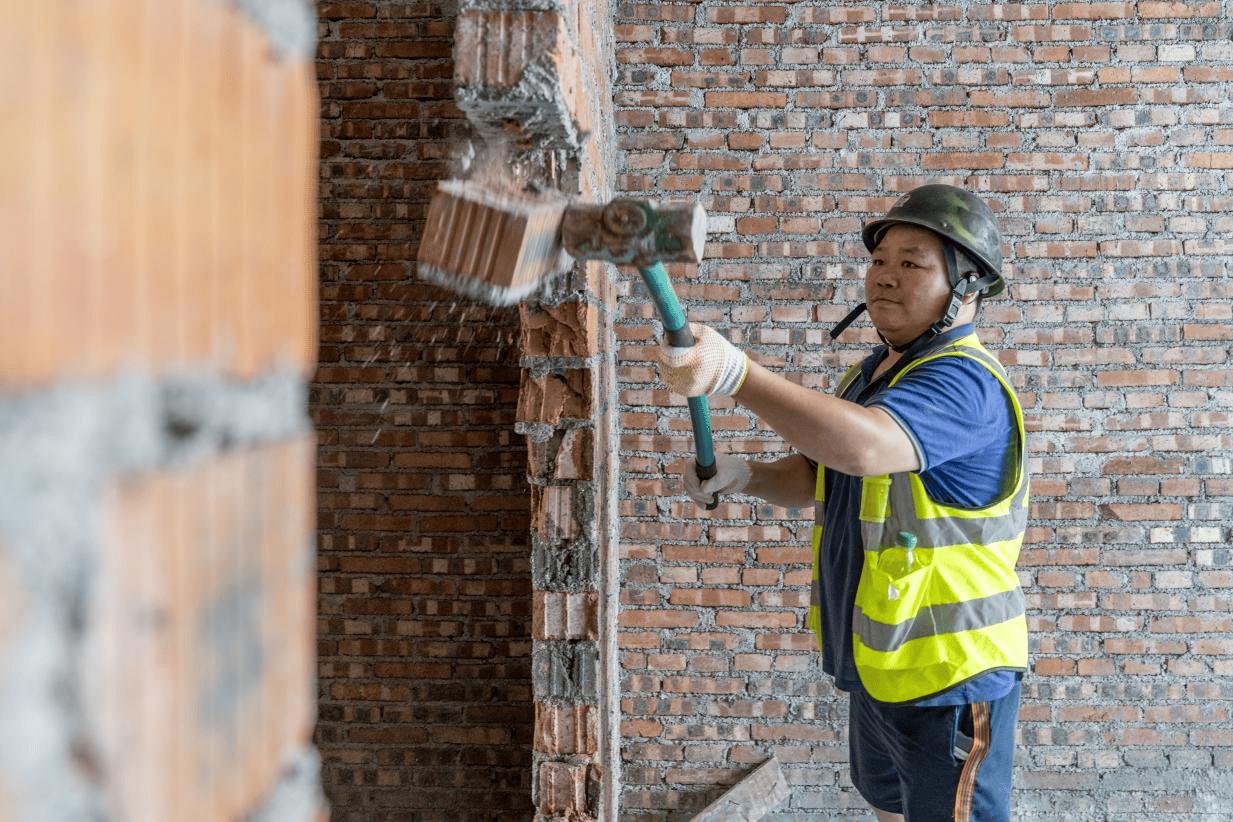 △工作人员正在拆除违建墙体。