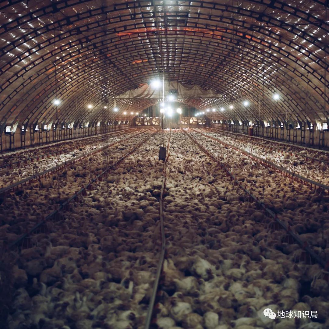 大型养鸡场内,成千上万只鸡挤在一起
