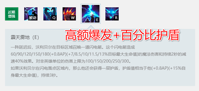 满级的E技能能造成180(+0.8AP)(+13%最大生命值)的高额伤害,同时获得0.8AP加15%最大生命值的护盾,主E技能能带给狗熊很高的爆发伤害,且高额的护盾值也会为狗熊对拼增添胜算。