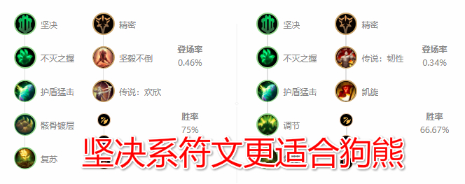 副系符文的凯旋和坚毅不倒是狗熊这类战士必备选择,凯旋提供给狗熊线上丝血反杀的可能性,同时提升狗熊后期团战中的生存能力,而坚毅不倒效果“血量越低,伤害越高”可以和主系符文复苏相互契合,就比如W技能和E技能,生命值低于15%的情况下,坚毅不倒和复苏的效果都会被开发到最高,提高伤害的同时还能有更强的回血能力和护盾值。