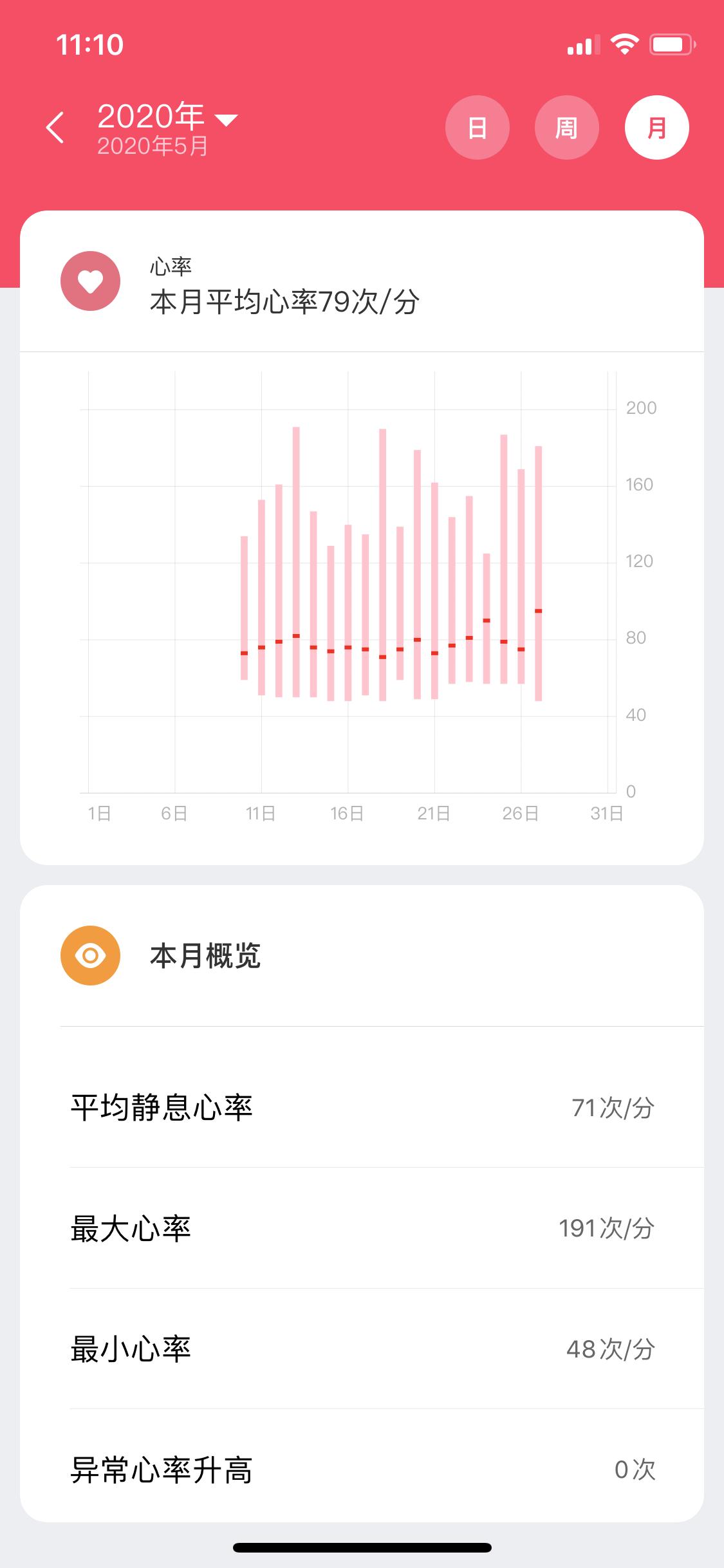 24小时心率监测功能比较实用,能够清晰地看到各个时间段的心率,可惜的是没有房颤提醒的功能;