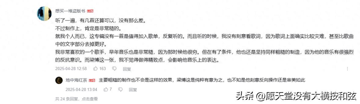 这一段话落在了打击乐博士叨叨冯这里直接给出了专业答案:这不是梁博精益求精,而是他知识的匮乏。然后他表达了自己对于梁博专辑的看法:脚踩西瓜皮,滑到哪算哪。没有一个明确的目的和创作动机。