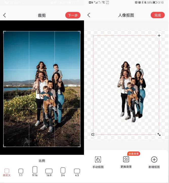 点击选择【人像抠图】功能,从手机相册中上传图片文件,点击【下一步】按钮,等待几秒就能消除背景、抠出主体了~