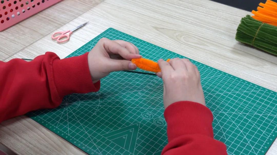 第一步:取出一根橙色扭扭棒,两头保留1厘米左右,将其缠绕在一根塑料棒上