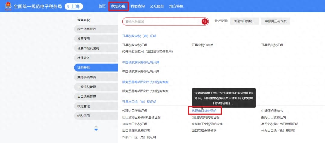 登录新电子税局后,点击【我要办税】-【证明开具】-【开具出口退(免)税证明】-【代理出口货物证明】。