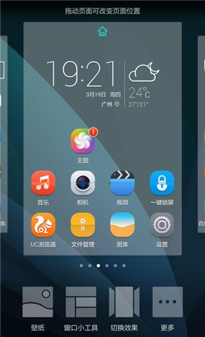 1、在屏幕上张开两个手指,进行合并滑动,进入页面切换界面,这里不是为切换主界面,而是选择【更多】;