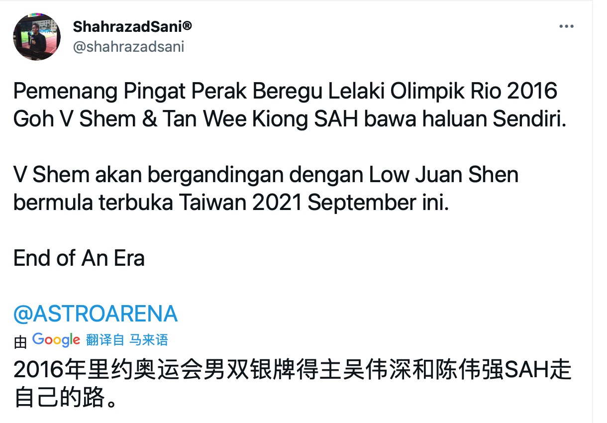 马来西亚媒体消息,里约奥运银牌得主吴蔚昇和陈蔚强日前决定结束彼此合作关系,吴蔚昇会在9月的中国台北公开赛上同新搭档刘隽程出赛。