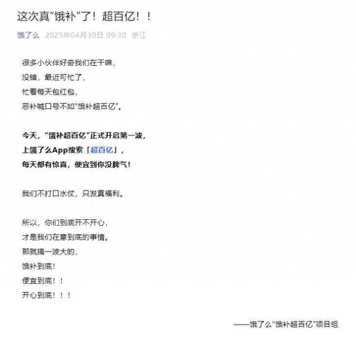 根据饿了么的微信公众号,公司宣布进一步加大平台补贴力度,即日起开启平台“饿补超百亿”大促。