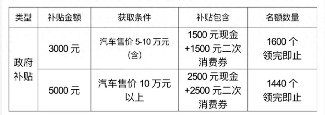 汽车购车补贴标准(二次消费券为50%立减券,用于发布的餐饮零售商户)