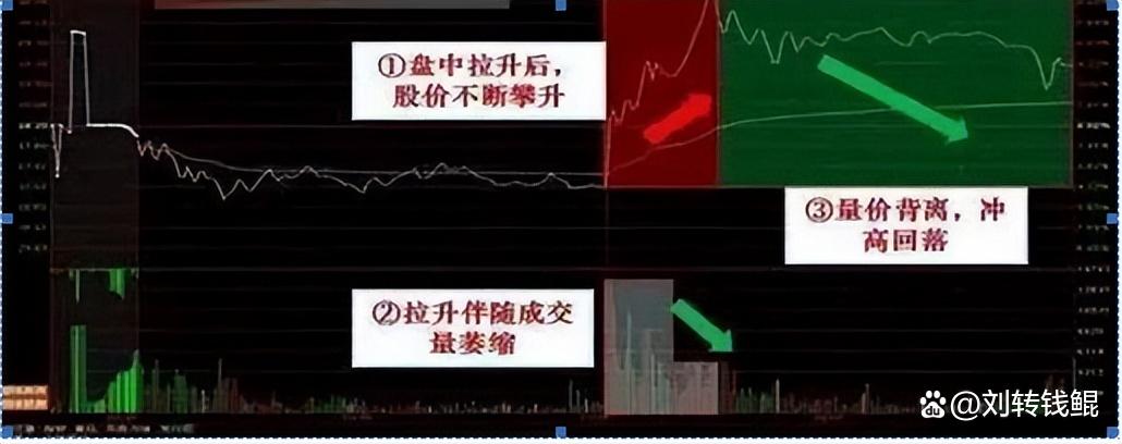 个股在盘中拉升后,股价不断攀升,同时伴随着成交量的萎缩,形成量价背离态势,股价很大可能会出现冲高回落现象,此时投资者不宜追高,控制好仓位或者是清仓离场。