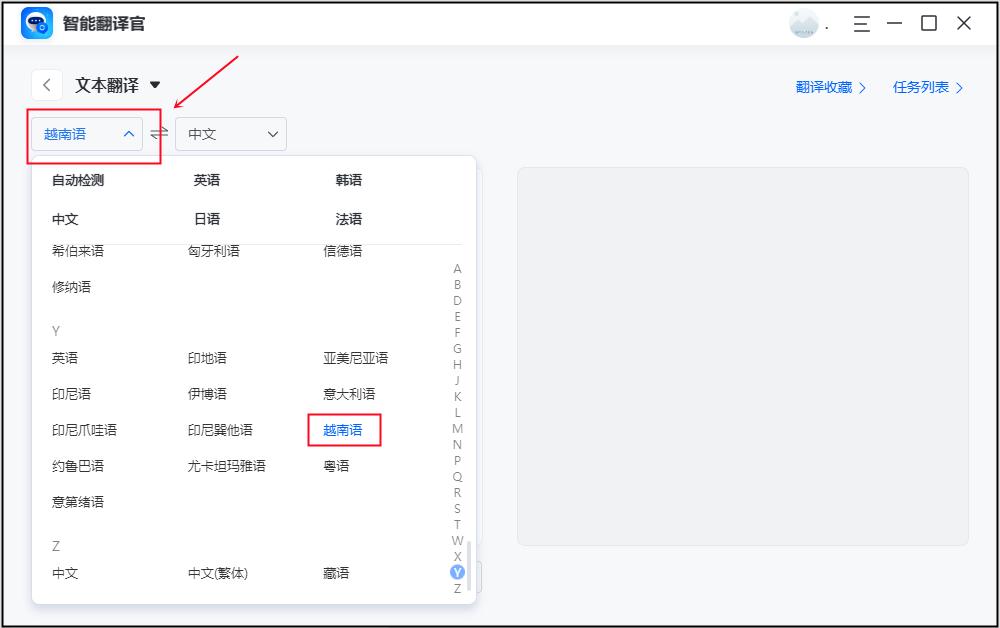 第二步:通过首页的按键我们来到了文本翻译界面,可以看到整个界面是由两个部分组成的。在左上角我们可以对翻译语种进行调整,需要注意的是翻译语种要根据文本来选择,这里我们调整为【越南语-中文】就好。
