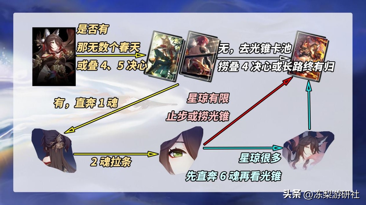 忘归人抽取顺序如下:角色本体=>判断是否有叠4/5决心或那无数个春天,有则1魂,无则光锥卡池先捞高叠决心或长路终有归=>1魂=>2魂=>光锥「长路终有归」=>直奔6魂或留给其他角色。