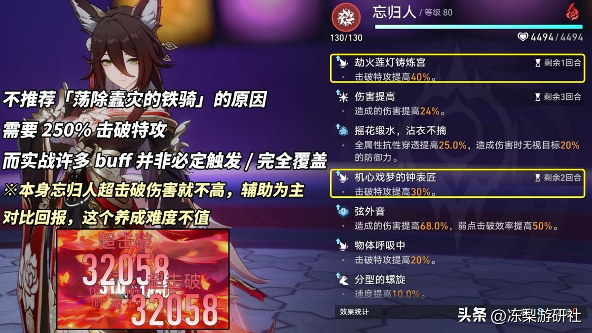 忘归人行迹属性24%击破、额外能力30%击破、4怪盗/2铁骑2怪盗32%击破,上述加起来已有86%击破。剩余可靠遗器副词条、光锥、击破绳、阮梅、同谐主、队友钟表匠遗器套装等方法补上,在超击破队中压力不大。