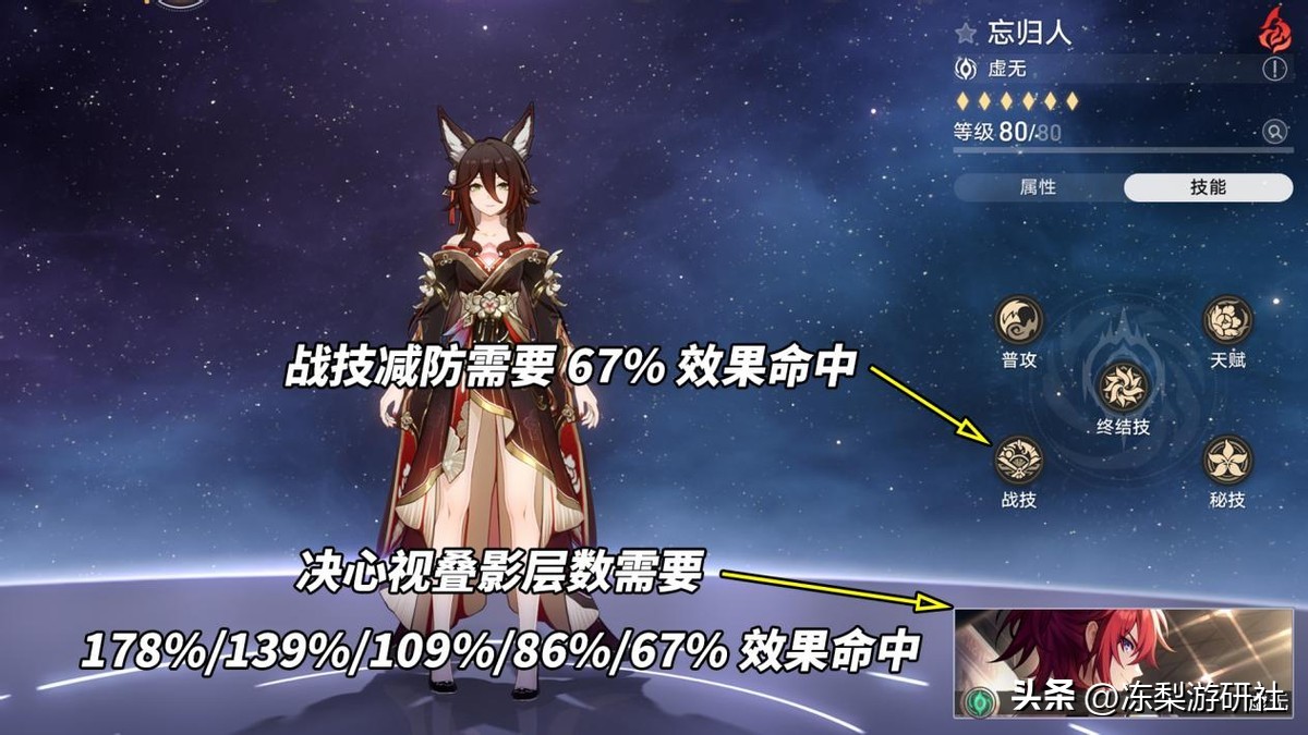 ※忘归人减防必中需要67%效果命中;若光锥携带叠1/2/3/4/5「决心如汗珠般闪耀」,为确保必中分别需要178%/139%/109%/86%/67%效果命中(叠1-3命中要求太高量力而行吧)。