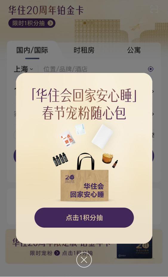 随即,立马在华住会APP上线了 “1积分抽华住会回家安心睡春节宠粉随心包”的活动,里面藏的都是华住酒店同款好睡的好用的“睡眠”好物。